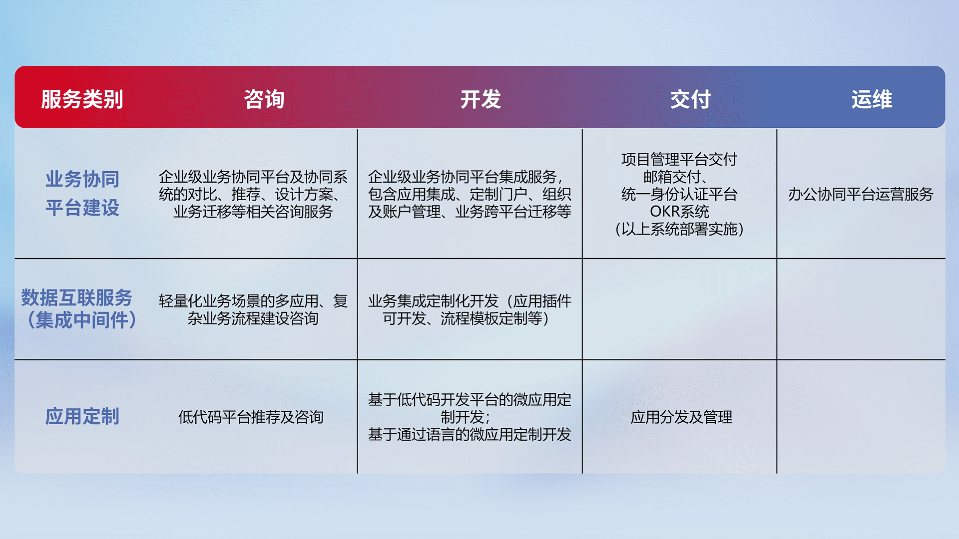 针对钉钉、、、企微、、IDaas等平台级产品提供产品的规划、、、、方案、、交付、、、定制化开发等服务,,,实现如统一协同办公、、、、智能客户服务、、、、混合会议管理、、、、智能数据查询、、、、等业务场景,,,实现数字化转型。。